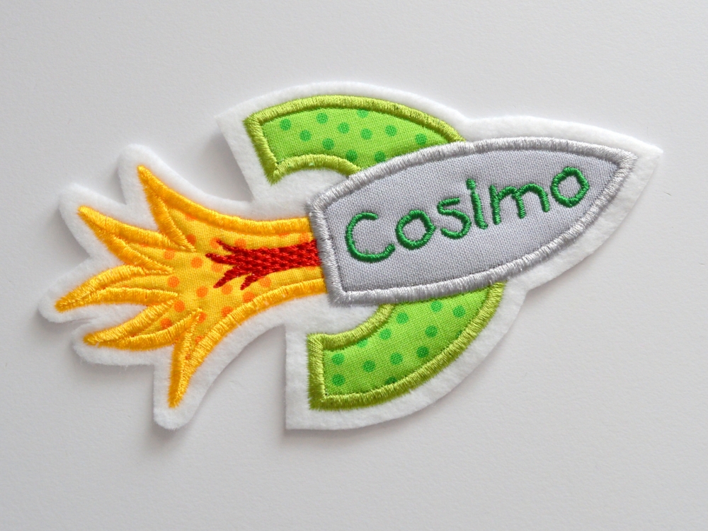 Aufnäher/ Applikation Rakete mit Name zum Reparieren von Löchern in Kleidung, Shirts, Hosen oder zum Verschönern von Taschen, Kleidung, Kissen. Der eigenen Fantasie sind keine Grenzen gesetzt.