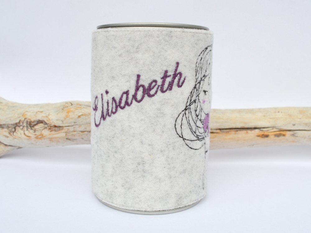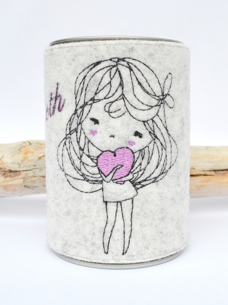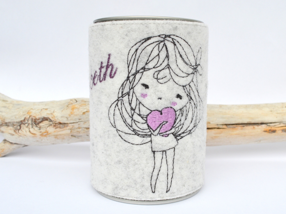 Hübsche Spardose mit Filzhülle (hellgrau) ummantelt, bestickt mit dem Namen und einem Mädchen mit Herz (flieder).