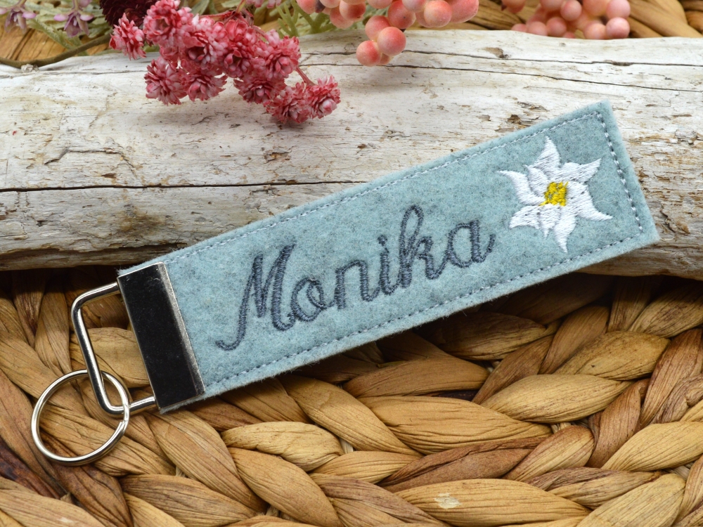 Schlüsselanhänger Filz mit Name und Hirsch / (Variante) eisblau Edelweiß Schreibschrift