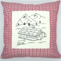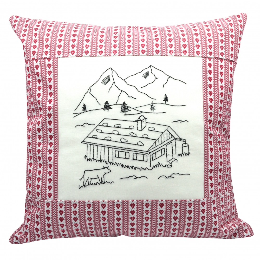 Der Kissenbezug besteht aus weißen und einem rot/weißen Baumwollstoff aus dem Hause Westfalenstoffe, bestickt mit einer Almwiese mit Kühen. Das Bild wurde von uns selbst gezeichnet und als Stickmotiv digitalisiert.