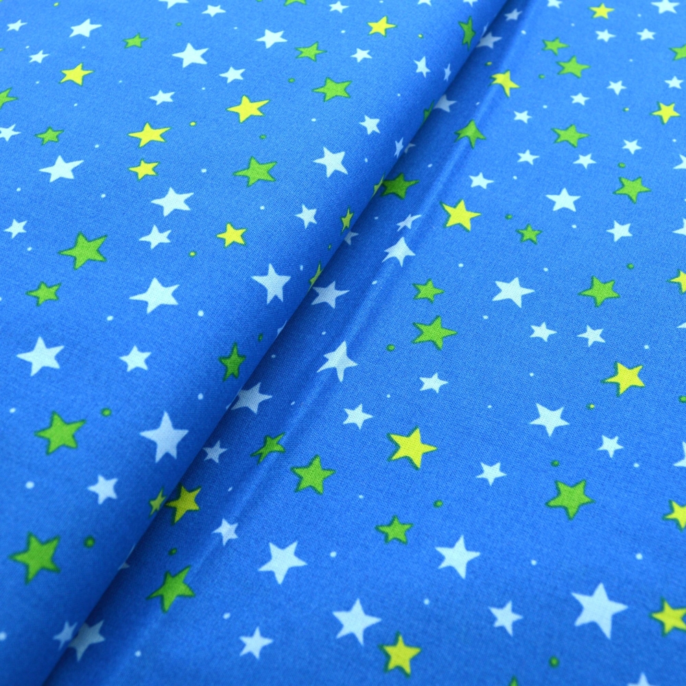 Wunderschöner Baumwollstoff aus dem Hause Westfalenstoffe der Serie "Junge Linie 010518236" in der Farbe blau mit Sternen in grün und blau, Druckstoff