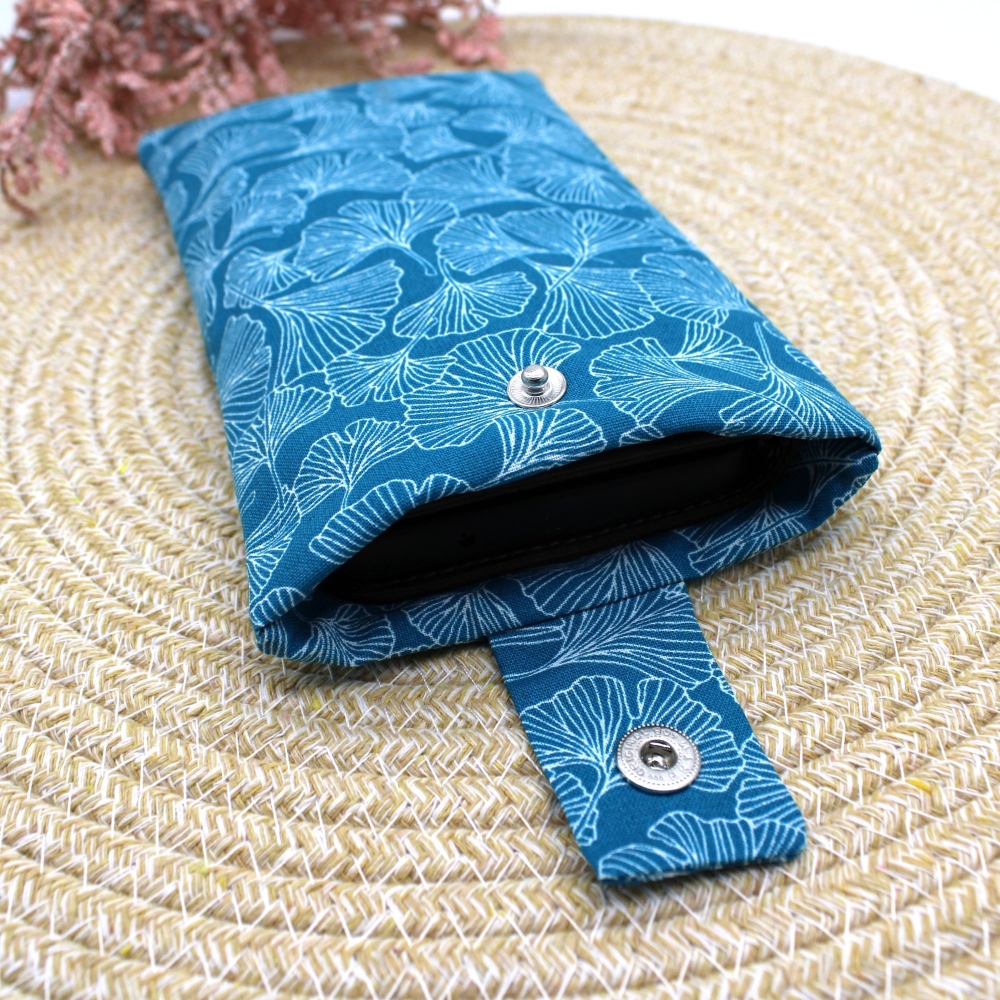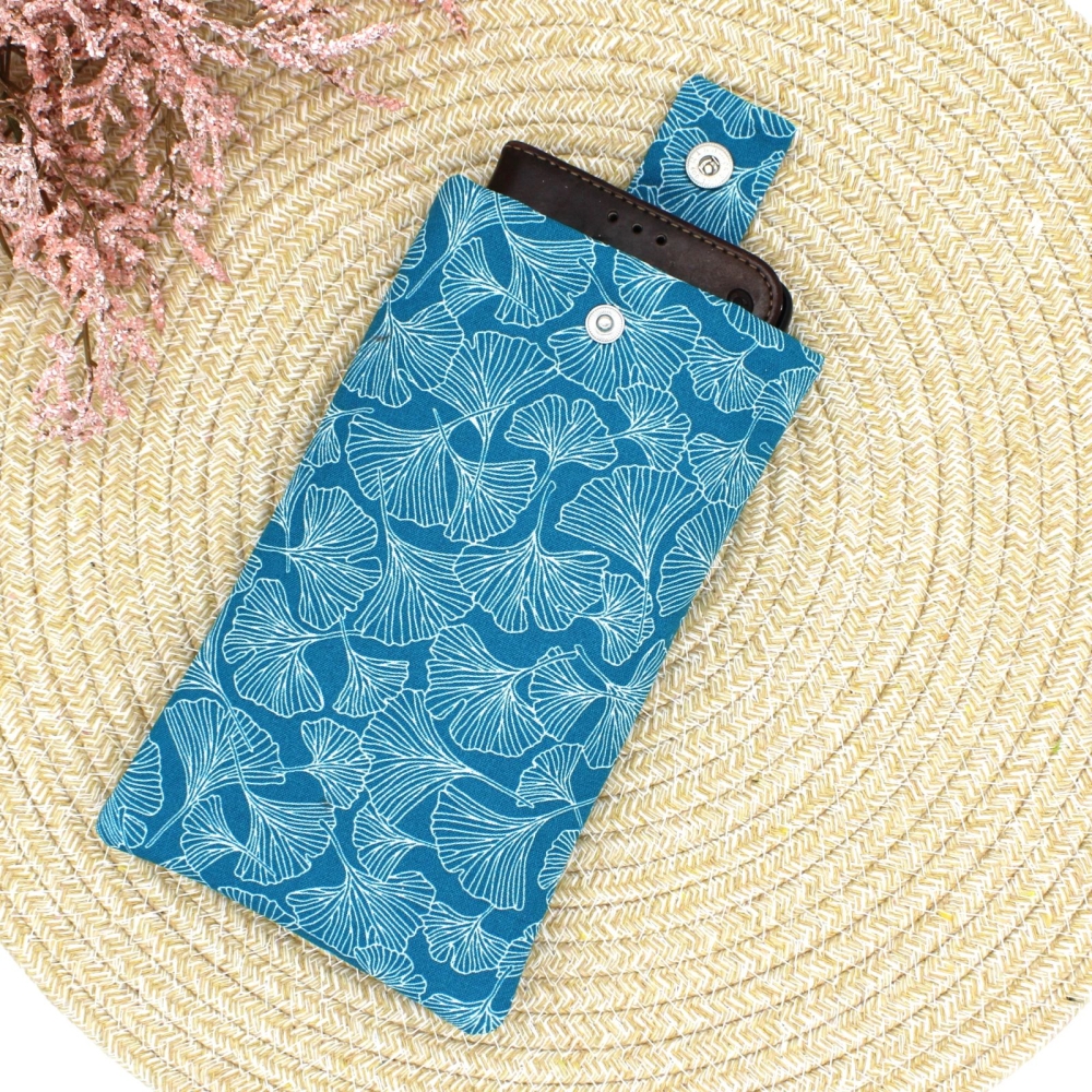 Meine Handyhülle vereint stilvolle Rankenmuster mit schützender Struktur. Die äußere Schicht besteht aus hochwertigem türkisem Baumwollstoff, der jedes Smartphone zu einem eleganten Blickfang macht. Innen ist sie zusätzlich mit mit einer weichen Vlieseinlage gefüttert, die dem Gerät zuverlässigen Schutz vor Stößen bietet.