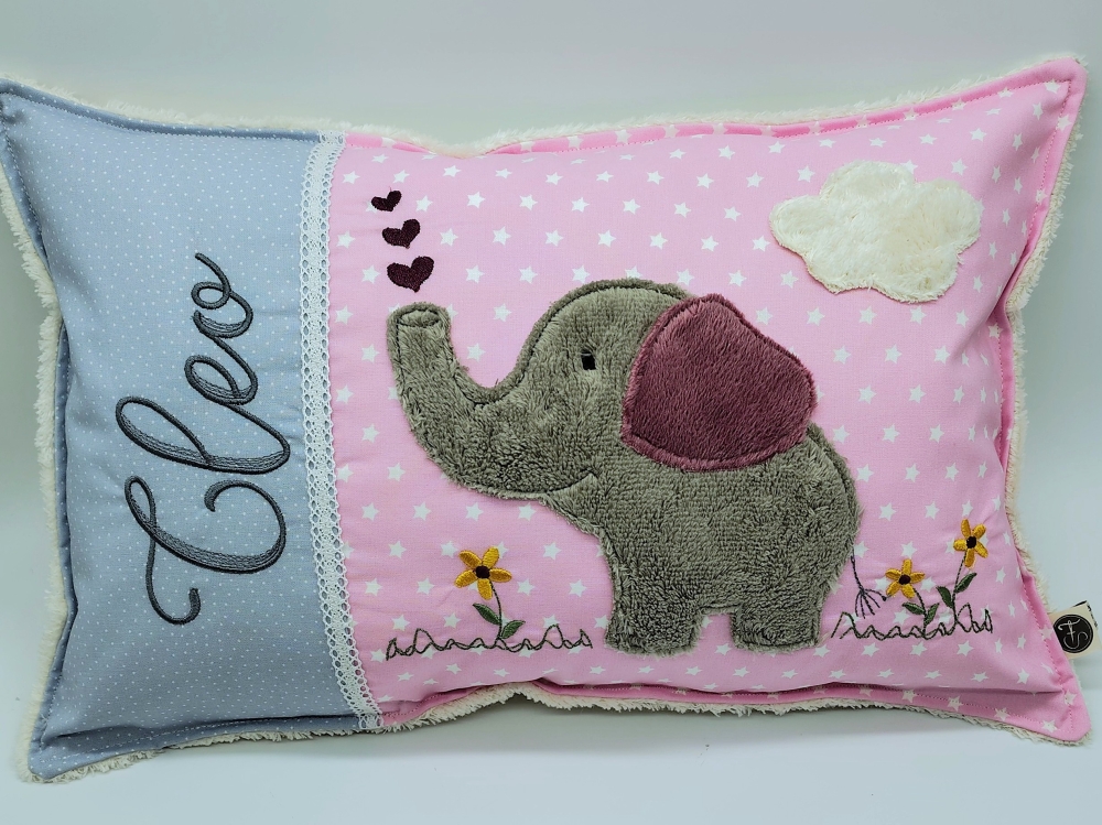 Kissen mit einem süßen Elefanten bestickt, der kleine Herzen trötet!