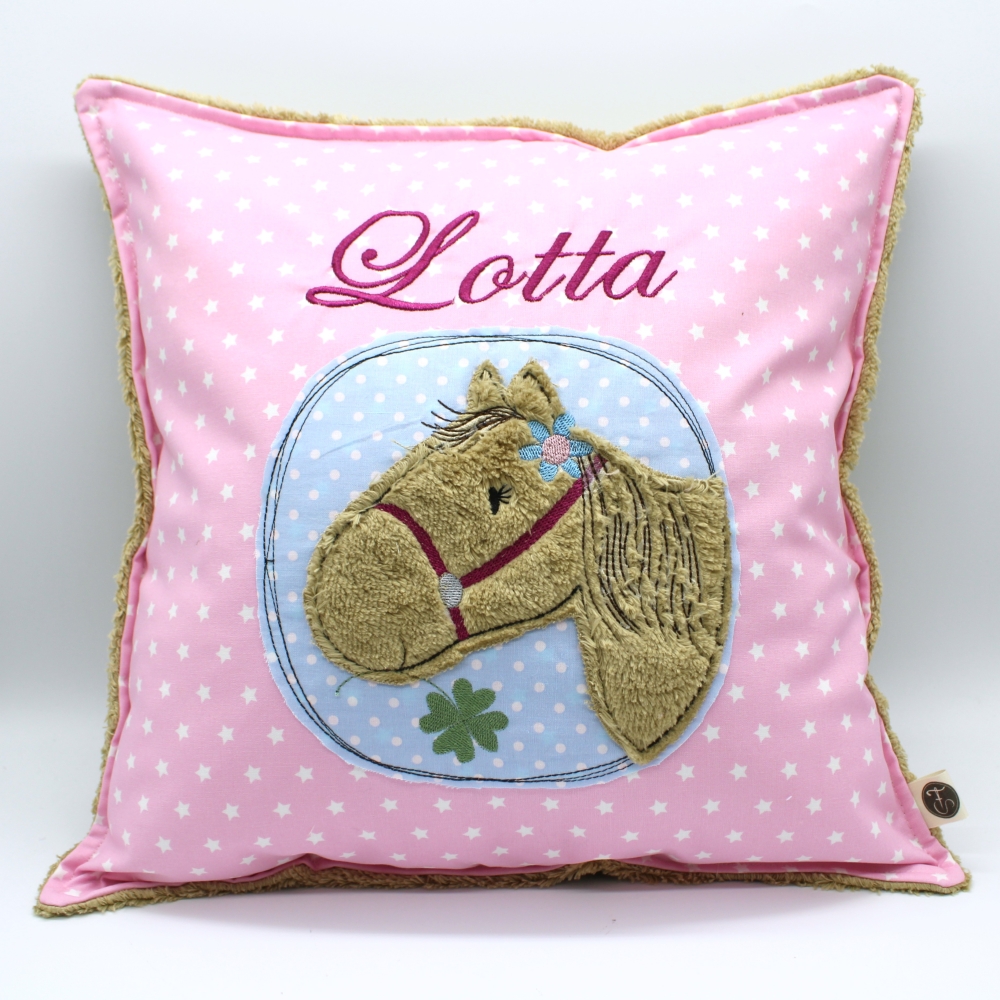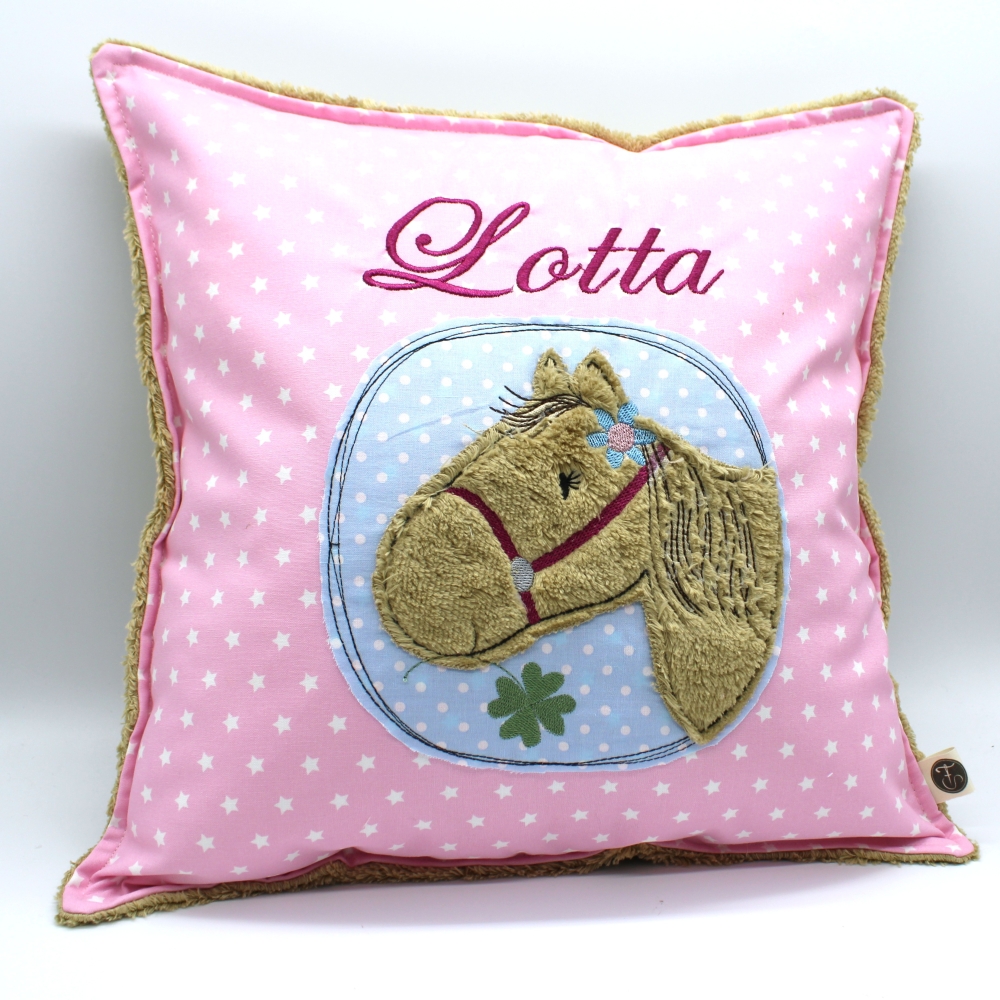 Es besteht auf der Rückseite aus einem beigen Bio-Baumwollplüsch. Für die Vorderseite verwende ich ebenfalls einen hochwertigen Baumwollstoff aus dem Hause Westfalenstoffe, auf dem das Pferd aufgebracht ist.