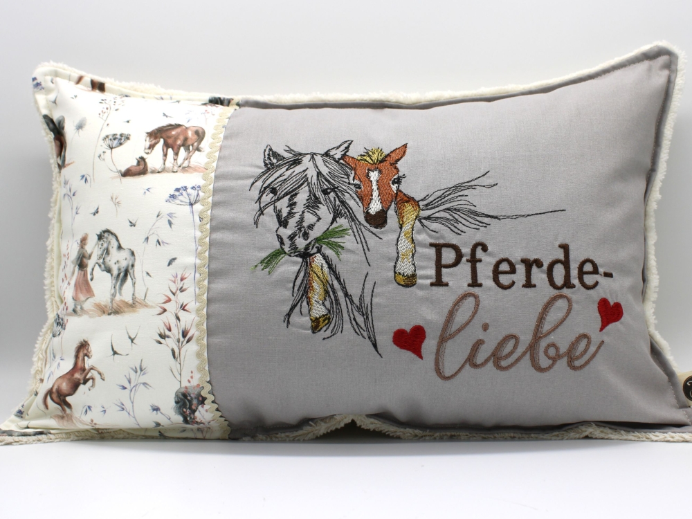 Süßes Kissen mit Pferd und Fohlen und dem Text "Pferdeliebe".
