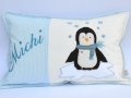 Es besteht auf der Rückseite aus Bio-Baumwollplüsch. Für die Vorderseite verwende ich ebenfalls einen hochwertigen Baumwollstoff, auf dem der Pinguin aus Plüsch in Kombination mit Stickereien aufgebracht ist.