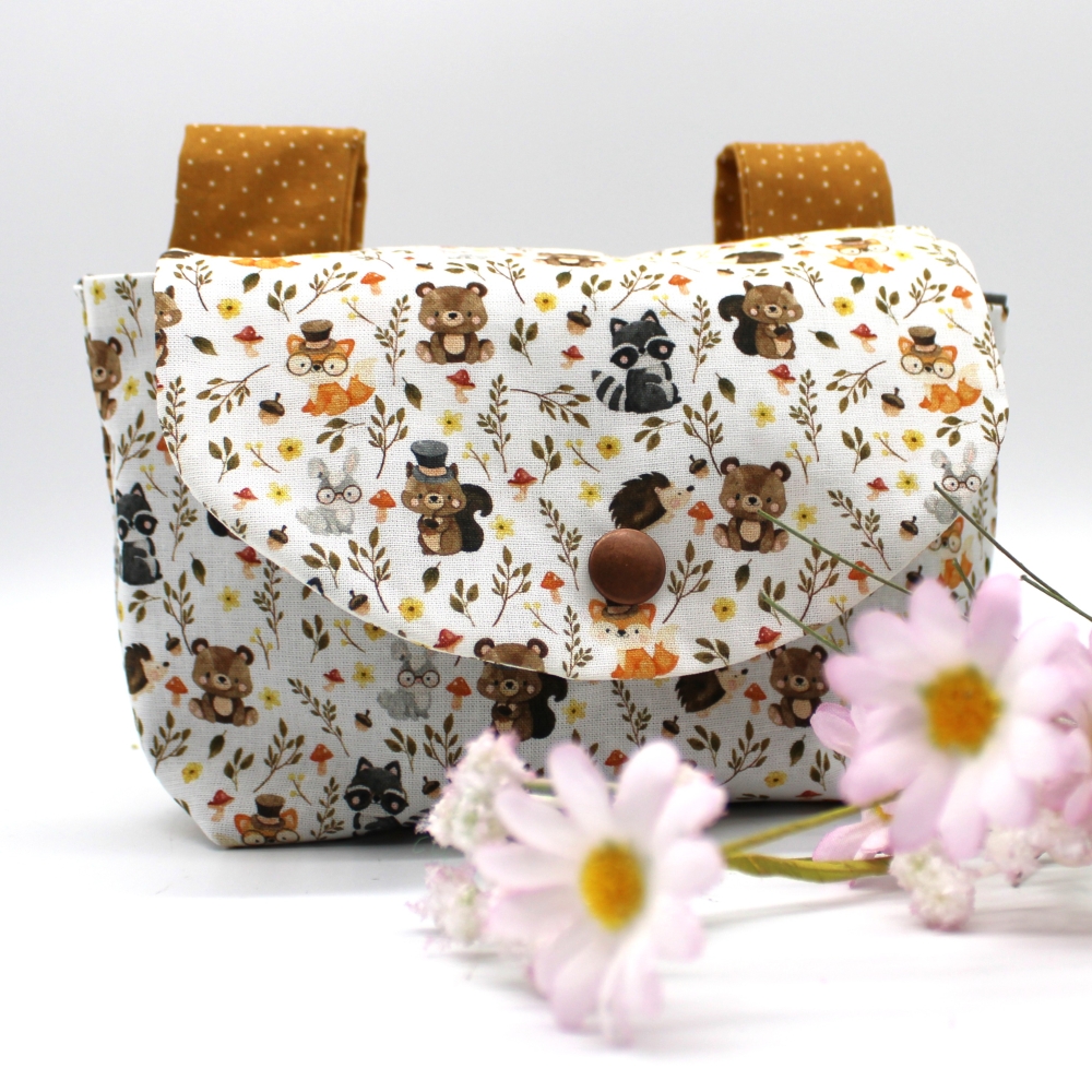 Kleine Lenkertasche aus Baumwollstoffen mit Waldtieren.
