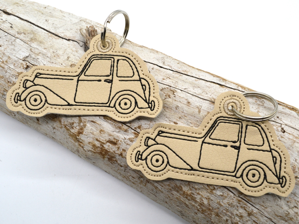 Schlüsselanhänger aus Kunstleder bestickt mit Auto.