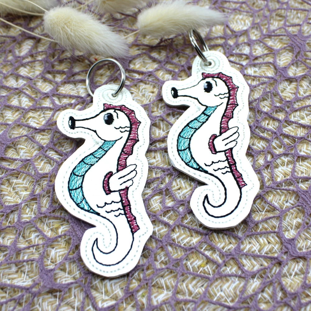 Schlüsselanhänger aus Kunstleder bestickt mit Seepferdchen.