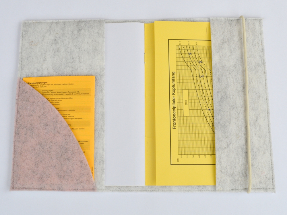 Passend für ein gängiges Kinder-Untersuchungsheft (Deutschland). Dieser kann in die aufgeklappte Hülle geschoben werden, verschlossen mit einem Gummiband. Zusätzlich befindet sich noch in der linken Hälfte ein Einschubfach für den Impfpass des Kindes.
