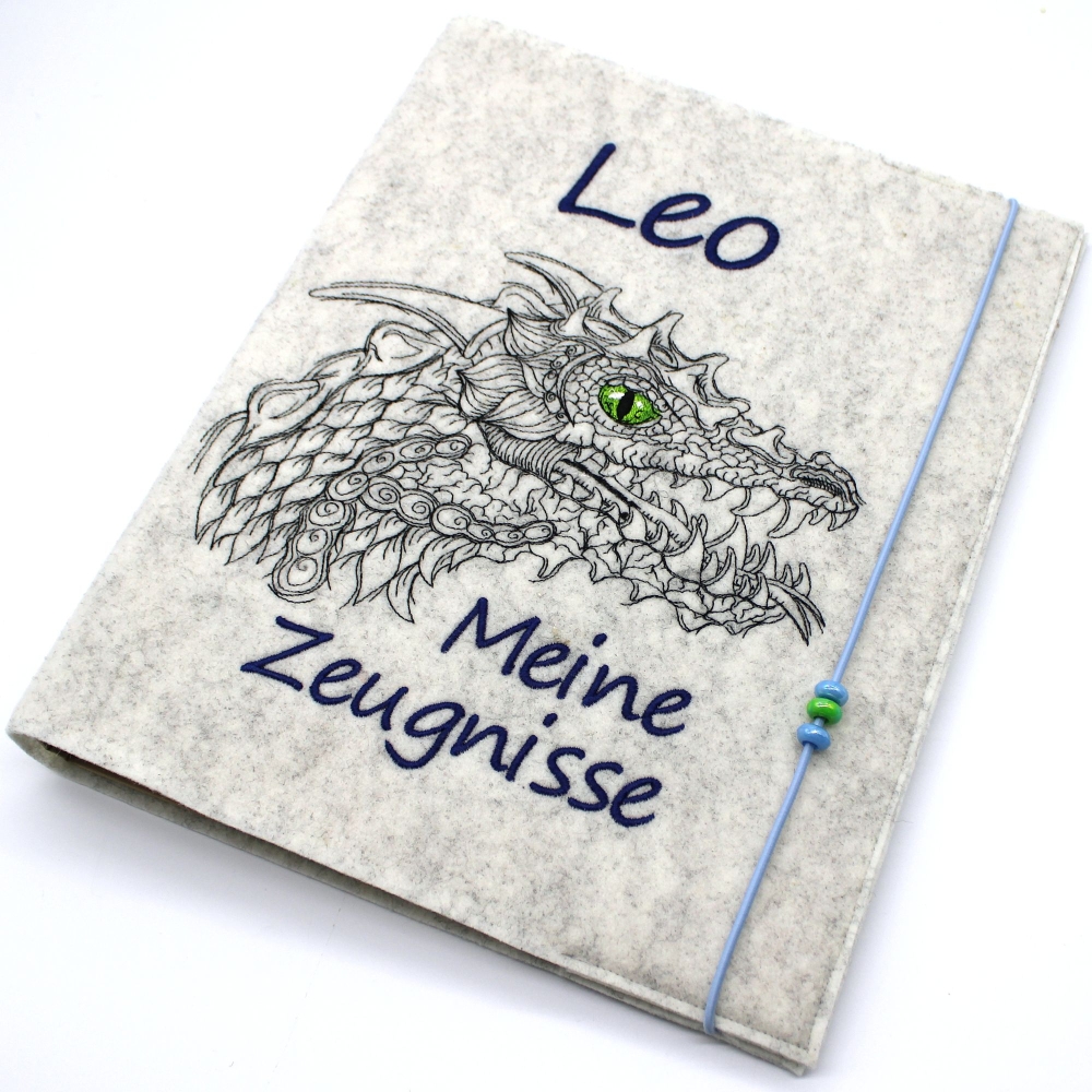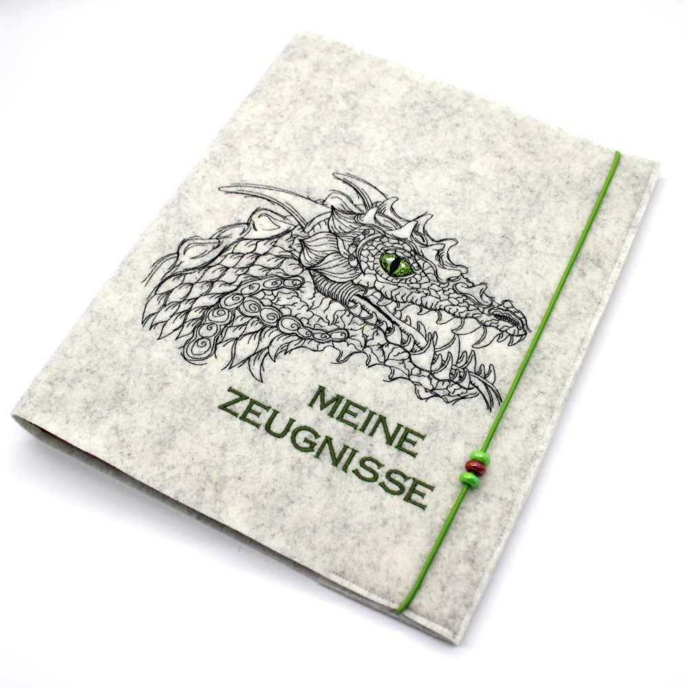 Zeugnismappe aus hochwertigem Filz bestickt mit einem Drachen.