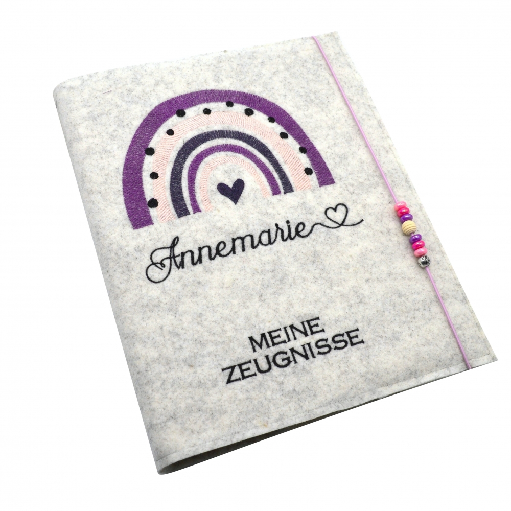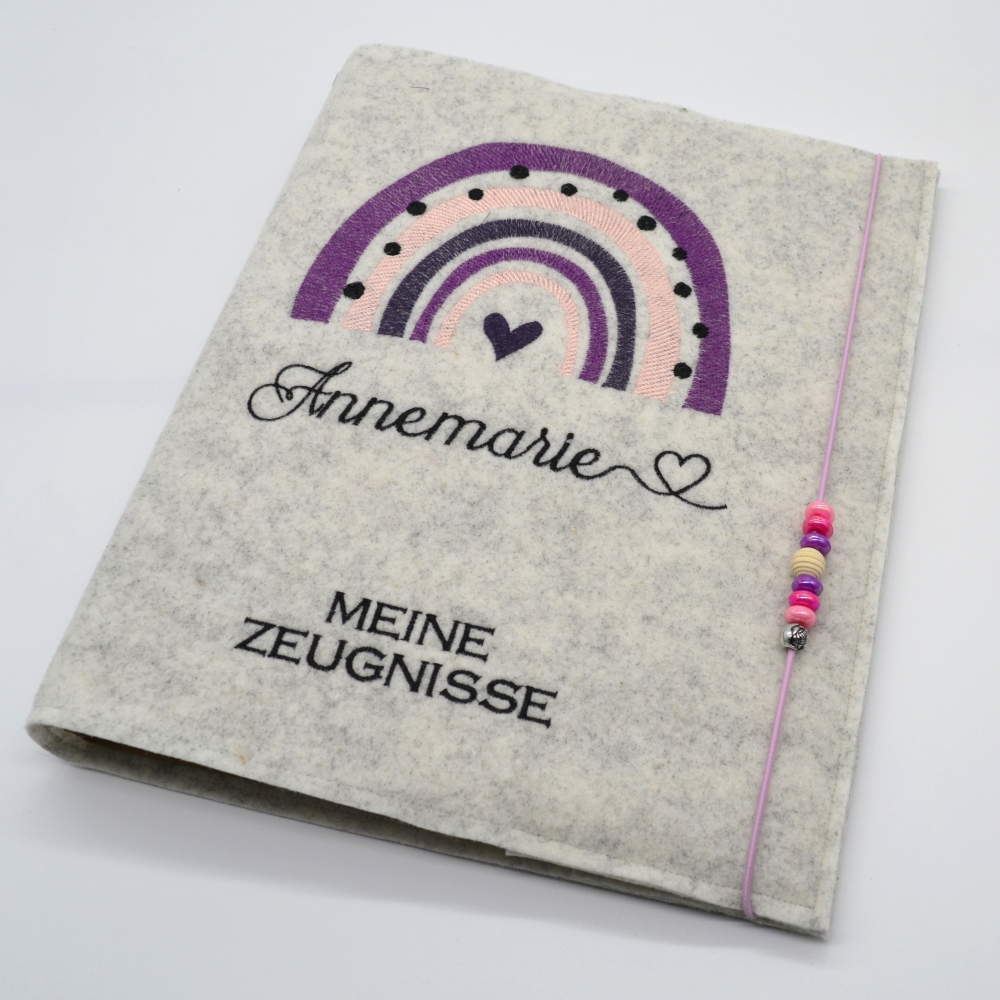 Zeugnismappe aus hochwertigem Filz bestickt mit einem Regenbogen.